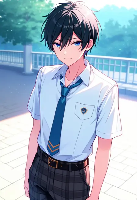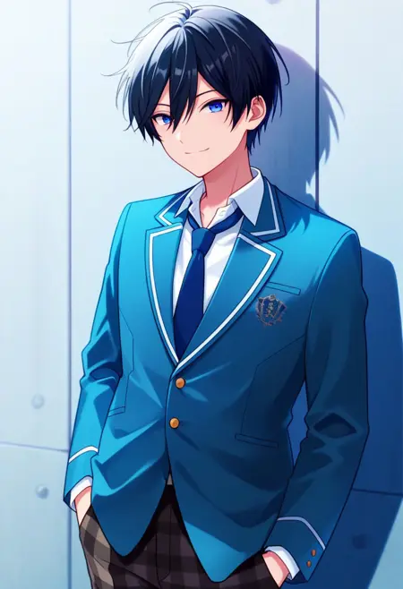 hokuthida, 1boy, male focus, solo, blue eyes, black hair, short hair, bangs, hair between eyes, school uniform, shirt, white shirt, collared shirt, necktie, blue necktie, jacket, blazer, blue jacket, long sleeves, pants, black pants, plaid pants, plaid, shoes, black footwear