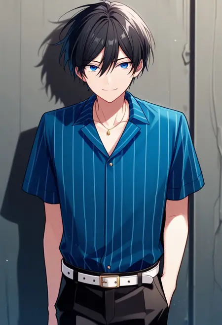 hokuthida, 1boy, male focus, solo, blue eyes, black hair, short hair, bangs, hair between eyes, jewerly, necklace, shirt, blue shirt, short sleeves, striped, striped shirt, vertical stripes, vertical-striped shirt, collared shirt, belt, white belt, pants, black pants,