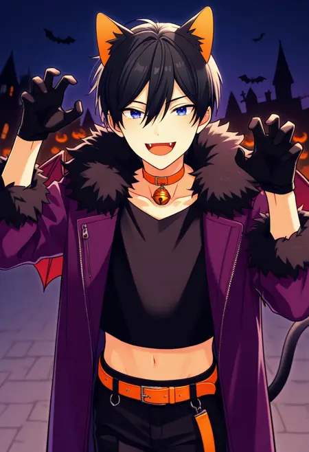 hokuthida, 1boy, male focus, solo, blue eyes, black hair, short hair, bangs, hair between eyes, halloween costume, animal ears, cat ears, jewelry, choker, neck bell, fur trim, coat, purple coat, open coat, open clothes, wings, bat wings, shirt, black shirt, zipper, zipper pull tab, midriff, gloves, black gloves, belt, orange belt, pants, black pants, tail, cat tail,