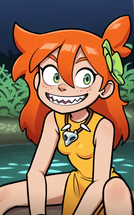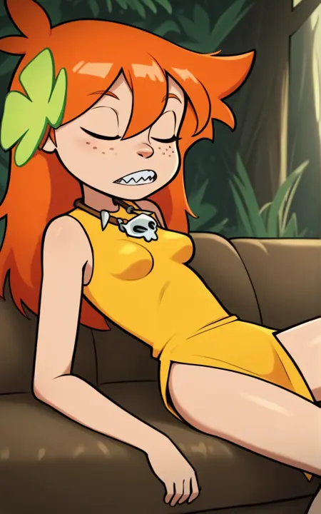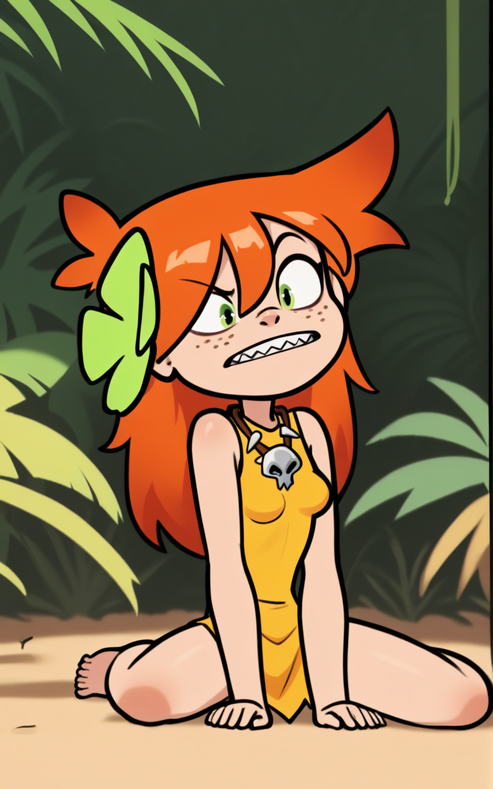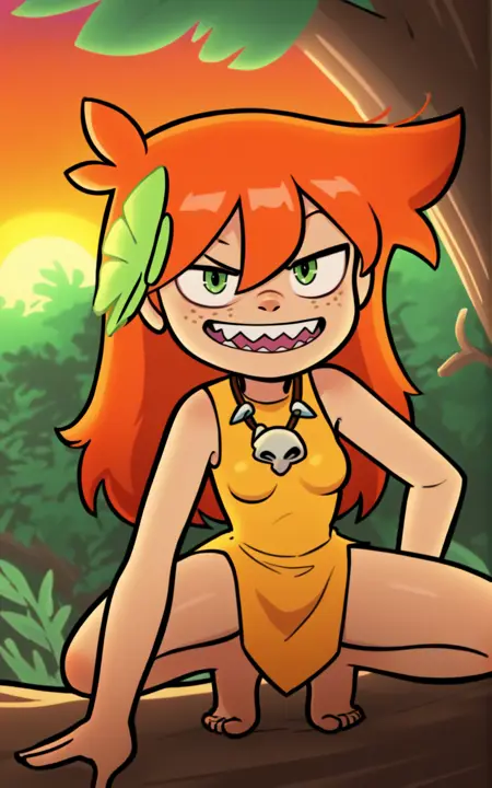 強化タグ: 緑の目、小さい胸、髪の装飾、髪の花、素足、鋭い歯、そばかす、オレンジ色の髪、長い髪
