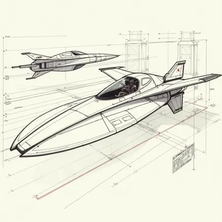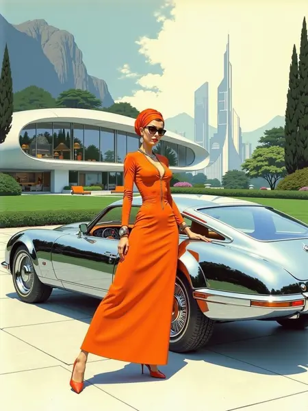 风格增强: 加入 "复古未来主义"、"平涂色彩"、"蓝图"、"酒精马克笔草图" 和 "水彩" 等术语,以强化经典的西德·米德美学。