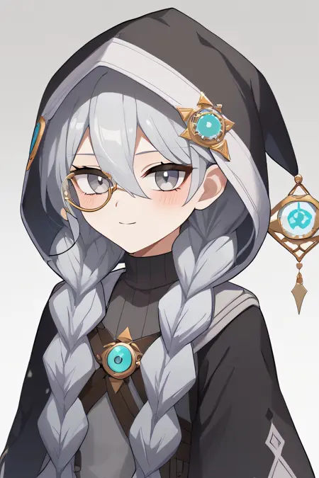 astellar, grey hair, grey eyes, twin braids, very long hair, hair between eyes