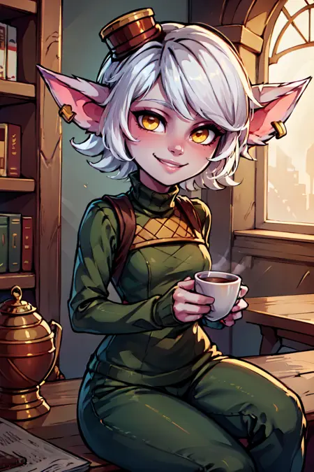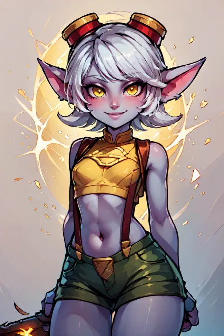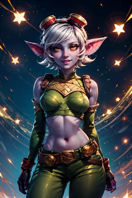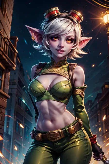 zzTristana, yellow eyes, pointy ears, white short hair, purple skin, goggles on head, green crop top, navel exposed, arm sleeves, fingerless gloves, green pants, belt, grenade belt,