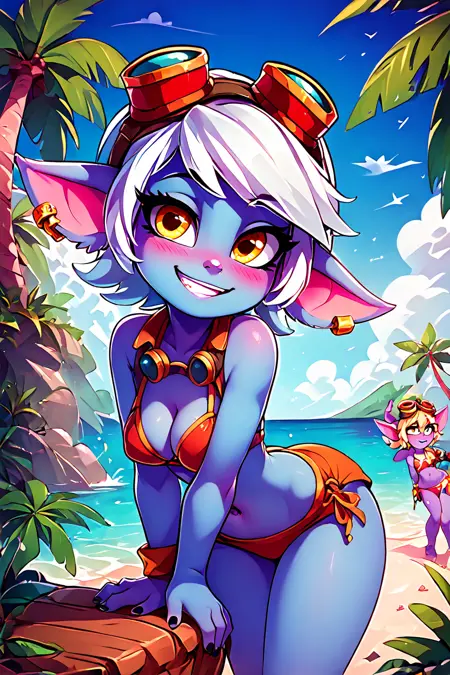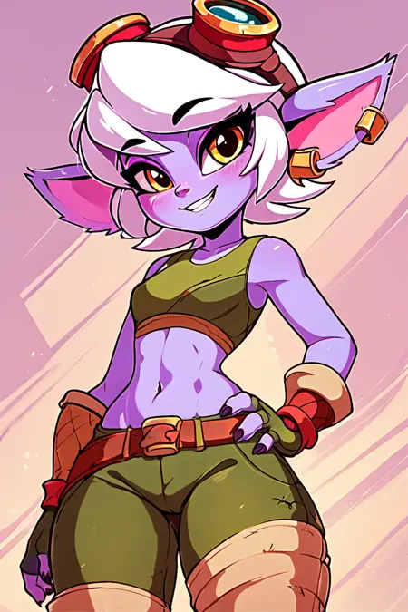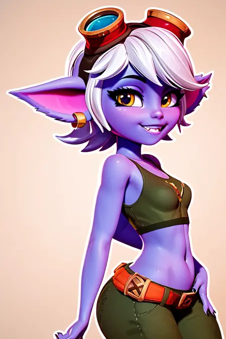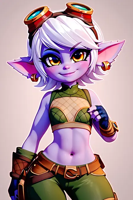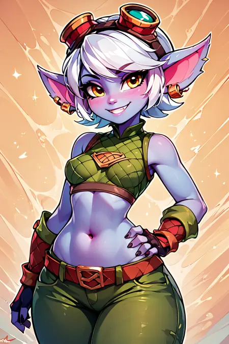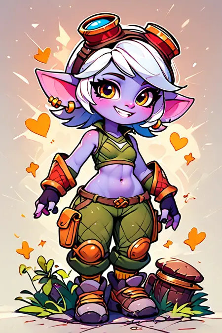 | トレーニングワード | zzTristana, yellow eyes, pointy ears, white short hair, purple skin,コピーしました! zzTristana, yellow eyes, pointy ears, white short hair, purple skin, goggles on head, green crop top, navel exposed, arm sleeves, fingerless gloves, green pants, belt, grenade belt,コピーしました! |