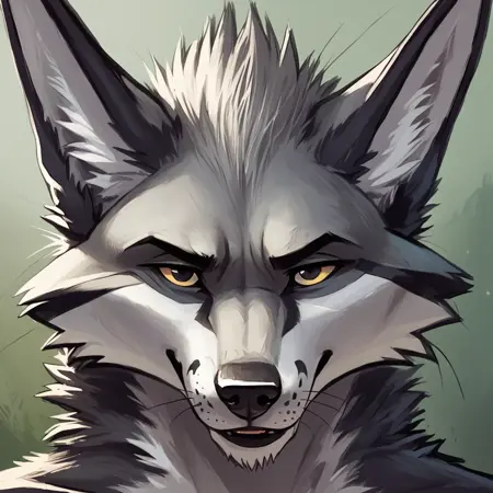 by sligarthetiger, sligar, furry, anthro, furry male, canid, canine, canis, coyote, fox, hybrid, black body, black fur, black eyes, black nose, grey hair, white body, white fur