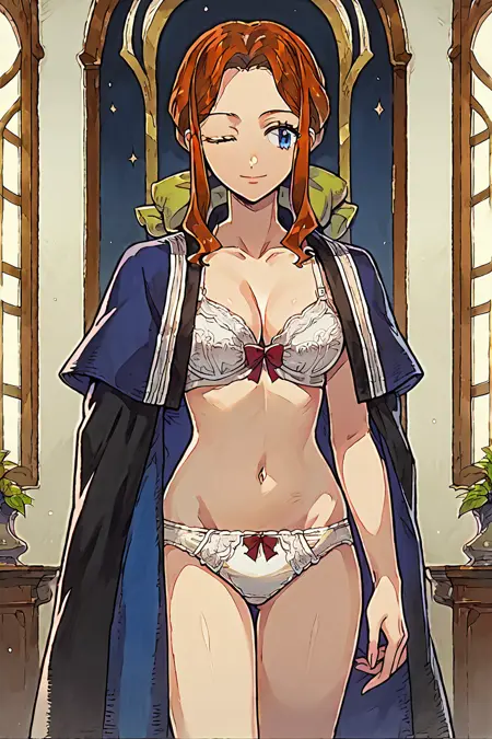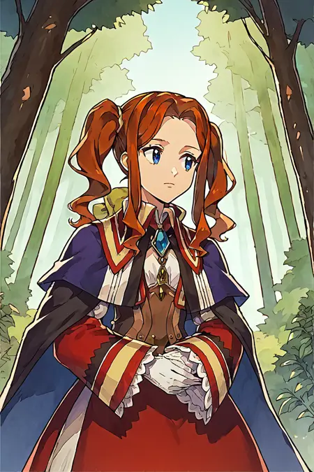labryna,bow, brown_hair, blue_eyes, gloves,