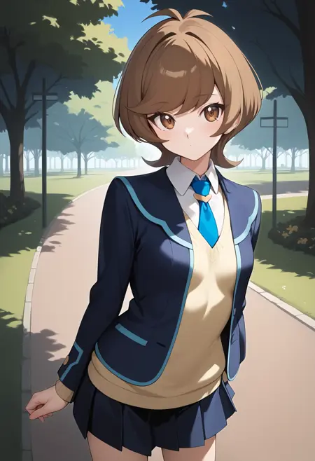outfit1aaaoi, short hair, brown hair, brown eyes, small breasts, school uniform, blue necktie, blazer, blue jacket, yellow sweater, long sleeves, pleated skirt, black skirt