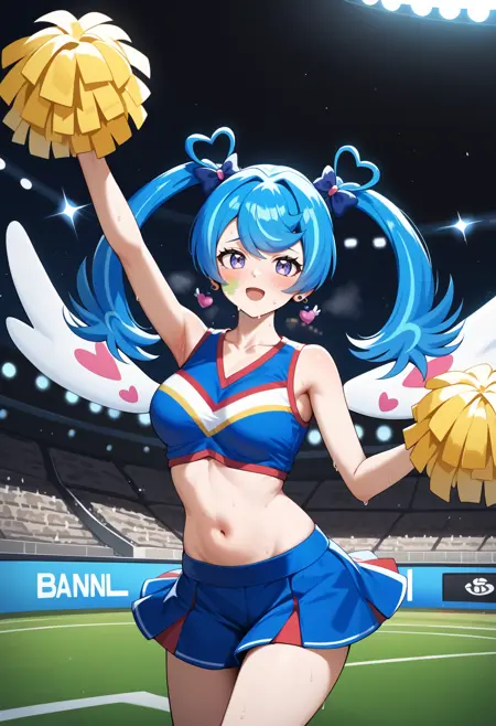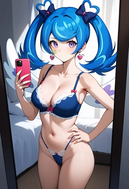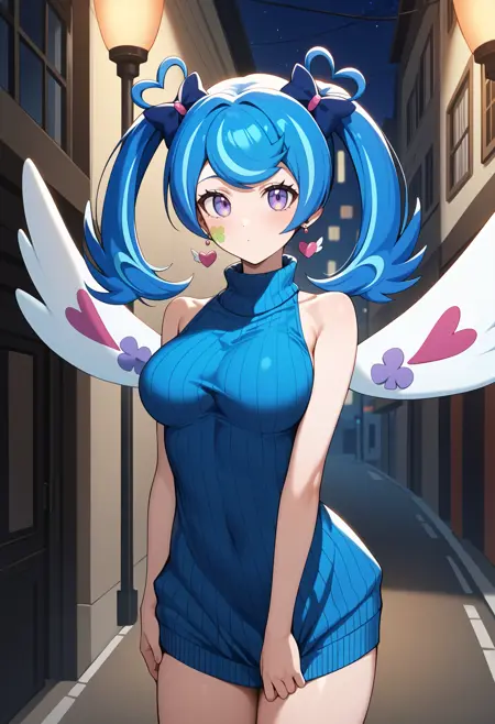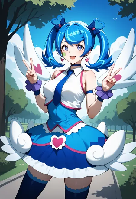 outfit2bbangel, blue hair, streaked hair, twintails, hair bow, earrings, facial mark, wings, breasts, choker, bare shoulders, blue necktie, collared shirt, white shirt, dress, sleeveless, arm strap, wrist cuffs, blue skirt, blue thighhighs