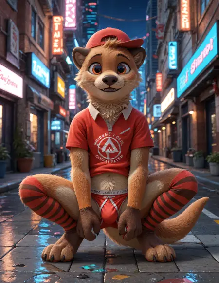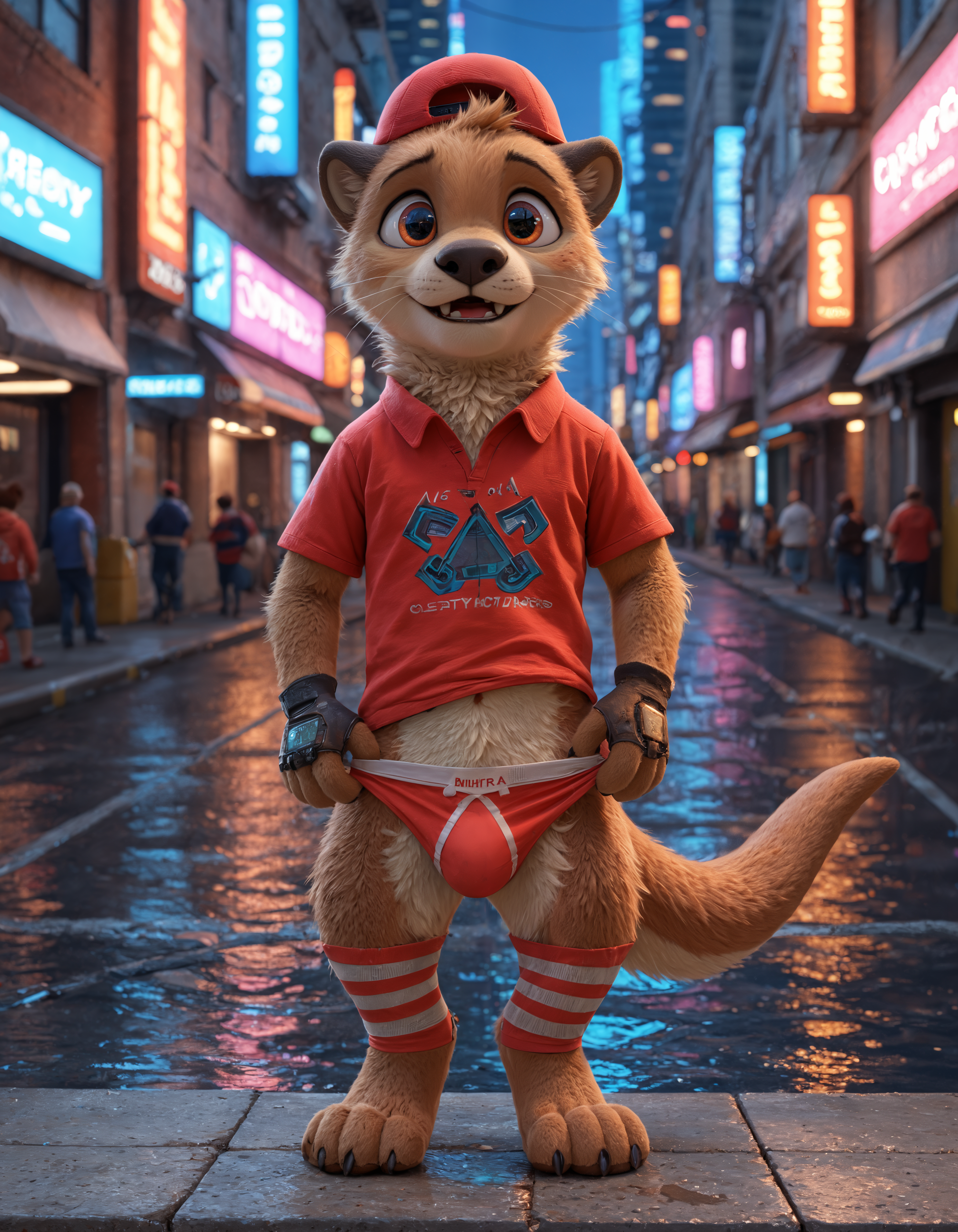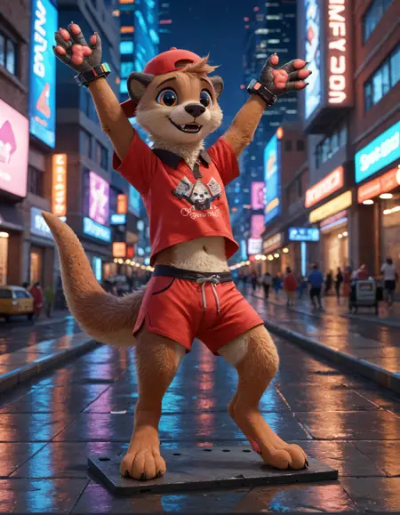// Illustrious: chester_the_otter, solo, furry male, 1boy, male focus, furry, tail, shirt, baseball cap, black eyes, red headwear, red shirt, body fur, short sleeves, cute