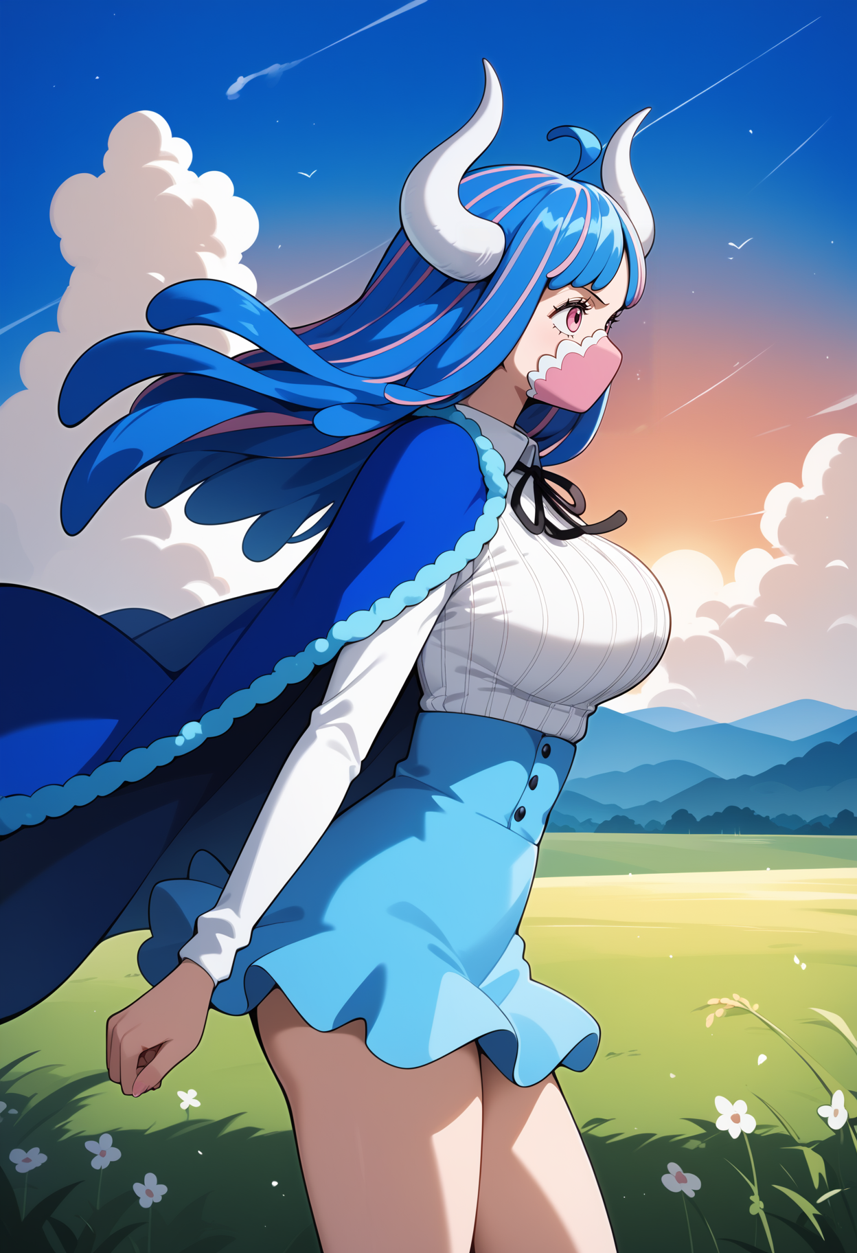 outfit1-1 (带斗篷)aaulti, long hair, multicolored hair, blue hair, ahoge, horns, pink eyes, mouth mask, pink mask, large breasts, blue cape, neck ribbon, ribbed shirt, white shirt, long sleeves, high-waist skirt, blue skirt