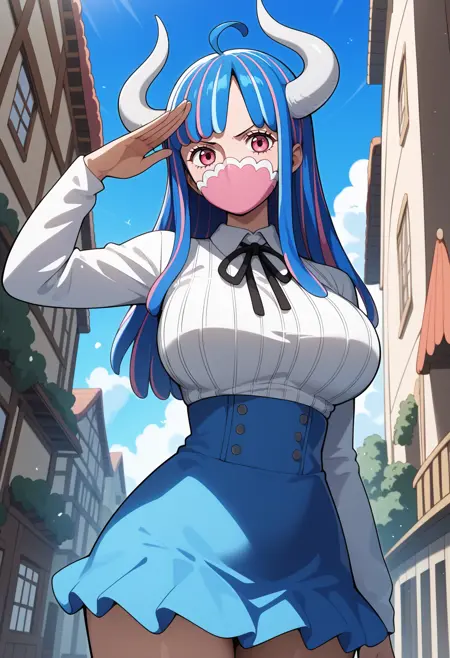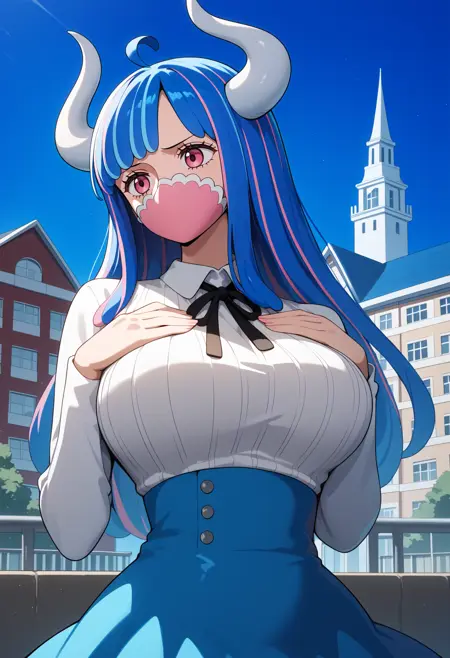 outfit1-2 (无斗篷)aaulti, long hair, multicolored hair, blue hair, ahoge, horns, pink eyes, mouth mask, pink mask, large breasts, neck ribbon, ribbed shirt, white shirt, long sleeves, high-waist skirt, blue skirt