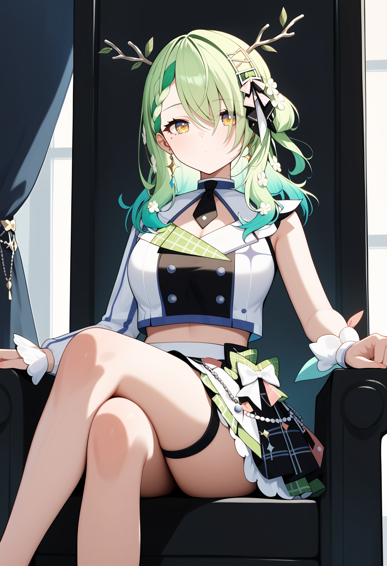 aafauna, long hair, multicolored hair, green hair, hair flower, hair ornament, antlers, braided bangs, earrings, yellow eyes, mole under eye, large breasts, idol clothes, short necktie, black necktie, bow, crop top, white jacket, single sleeve, wrist cuffs, layered skirt, white skirt, plaid skirt, thigh strap, single thighhigh