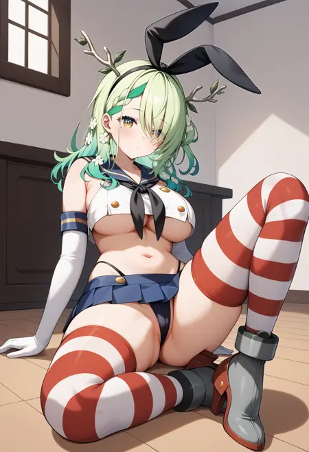 aafauna, long hair, multicolored hair, green hair, hair flower, antlers, black hairband, braided bangs, yellow eyes, mole under eye, large breasts, blue sailor collar, white shirt, black neckerchief, sleeveless, underboob, elbow gloves, white gloves, microskirt, blue skirt, highleg panties, striped thighhighs