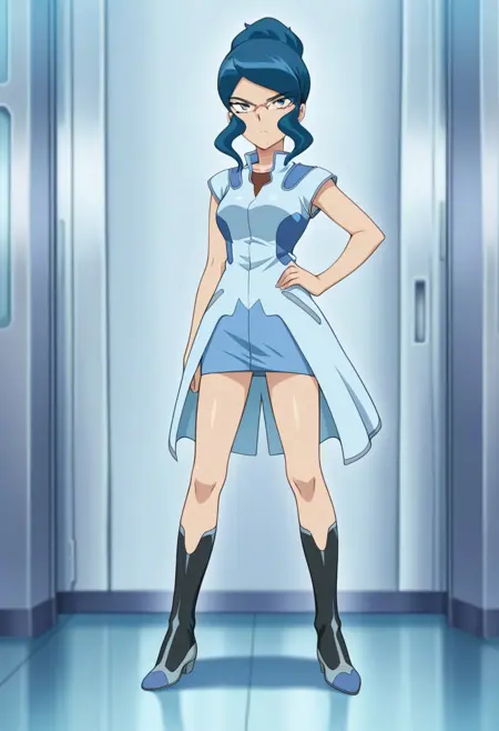 Prompt:bakugan, bakugan gundalian invaders, lena isis, 1girl, jewelry, glasses, solo, blue hair, earrings, necklace, ring, smile, blue eyes, adjusting eyewear, watch, wristwatch, closed mouth, sidelocks, Large breasts