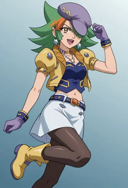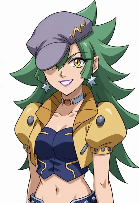 bakugan, bakugan gundalian invaders, zenet surrow, 1girl, solo, hat, jewelry, green hair, midriff, navel, multicolored hair, necklace, earrings, hair over one eye, spiked hair, cabbie hat, breasts