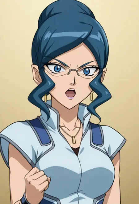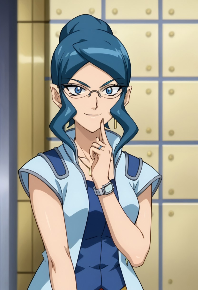 프롬프트: bakugan, bakugan gundalian invaders, lena isis, 1girl, jewelry, glasses, solo, blue hair, earrings, necklace, ring, smile, blue eyes, adjusting eyewear, watch, wristwatch, closed mouth, sidelocks, Large breasts