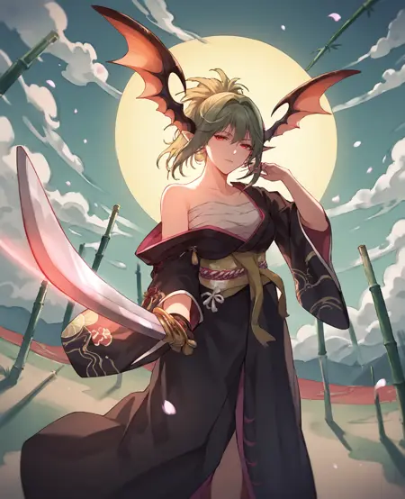 기본 복장: 일본식 옷, (어깨 노출), 붕대 감긴 가슴, (붕대 감긴 다리), 띠, (양말), 털 장식, 줄장식, 넓은/긴 소매, (손가락 없음) 장갑;