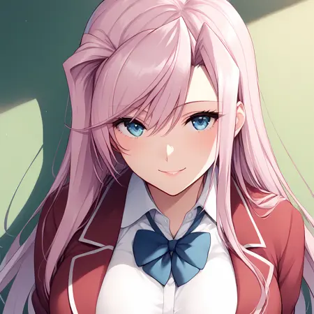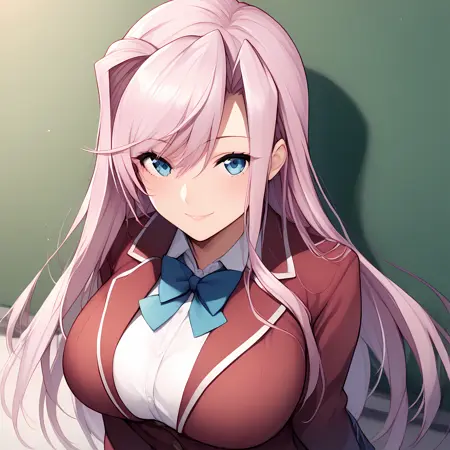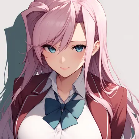 "粉发,长发,蓝眼,大乳房"(Pony 版使用 "巨大乳房" 标签),服装标签如下: