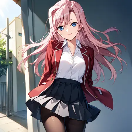 "粉发,长发,蓝眼,大乳房"(Pony 版使用 "巨大乳房" 标签),服装标签如下: