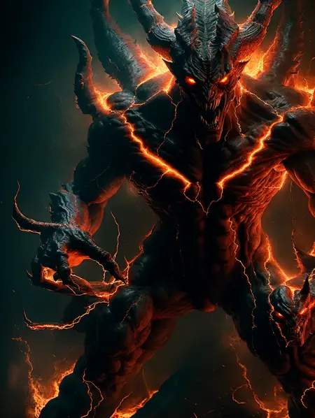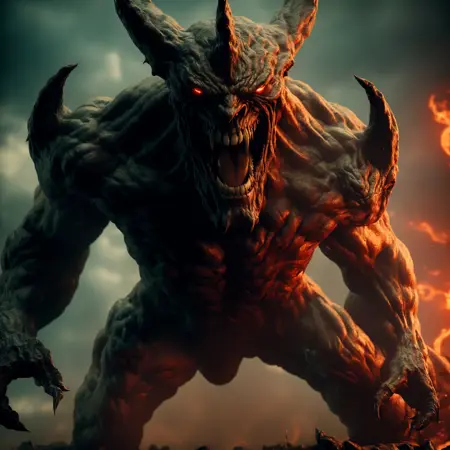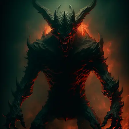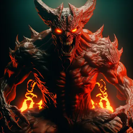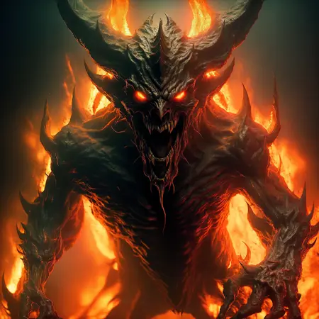 ohwxの悪魔の写真、地獄の主、悪意ある微笑み、燃える、永遠の炎、恐ろしい顔つき、恐怖、クローズアップ