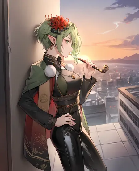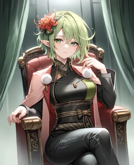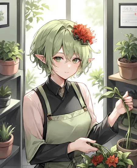 기본 특징: 녹색 머리카락, (중간 길이 머리), 녹색 눈, 뾰족한 귀, 귀걸이, 머리꽃(거미난초);