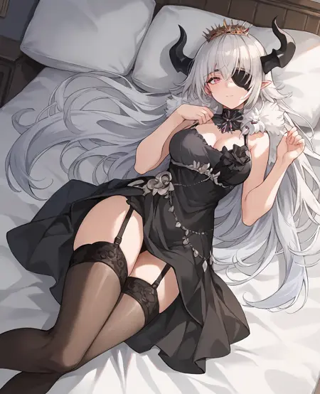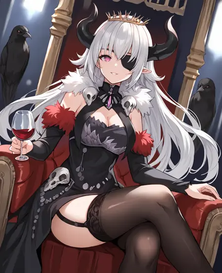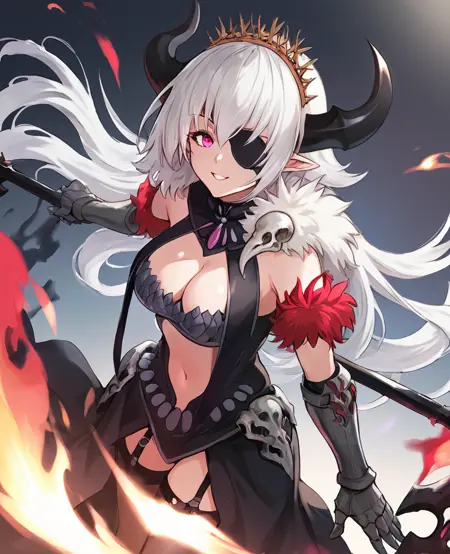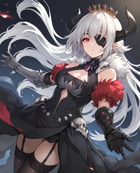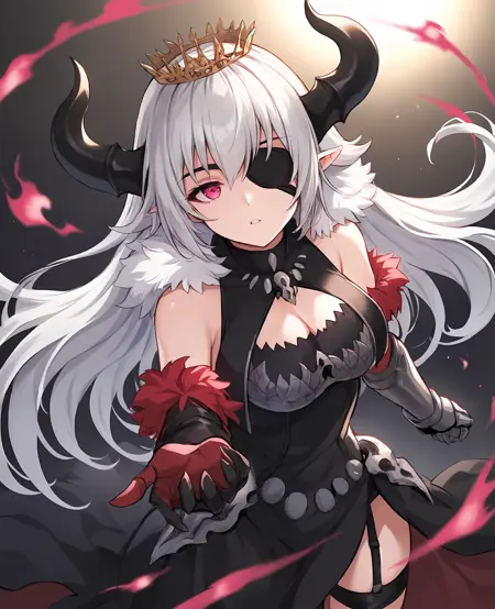 基本的特徴:白髪、(長い髪)、尖った耳、ピンク/パープルの目、アイパッチ、(片方の目を覆う)、王冠/髪飾り;