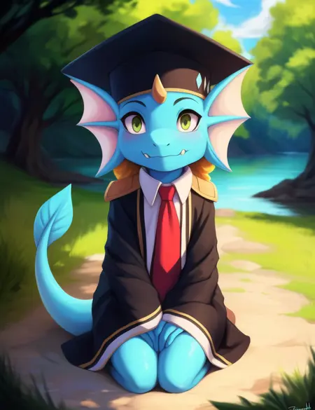 QinusAxia, blue skin, green eyes, red tie, tail, fangs, hat, cloth, black robe, white shirt, boots, Chibi,