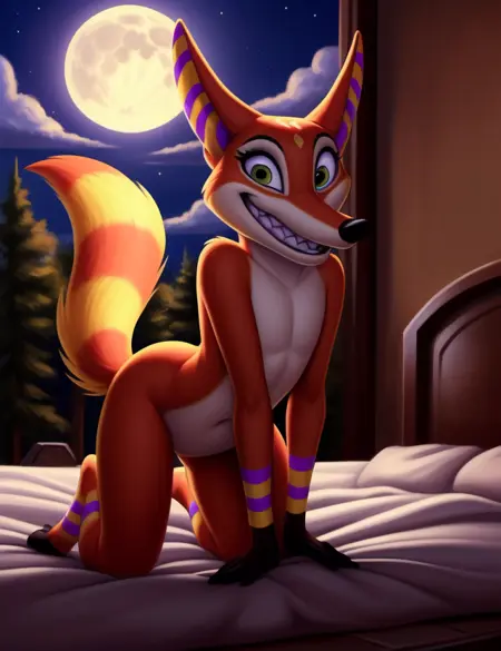 HueHueCa, fox, purple eyelids, green eyes, tail, black hands, chibi, nude,