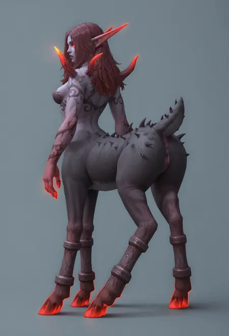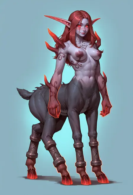 • 1girl, 뾰족한 귀, 색상이 있는 피부, 회색 피부, 긴 귀, 붉은 눈, 빛나는, 가슴, 긴 머리, 몬스터 소녀, 빛나는 눈, 배꼽, 발굽, 가시, 꼬리, 타우르