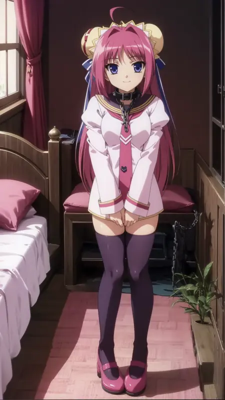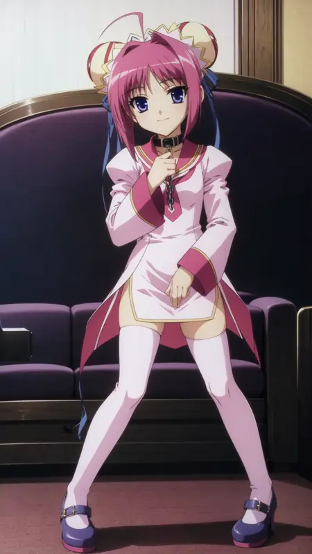 shoukyou, 1girl, solo, bun cover, double bun, hair bun, pink hair, zettai ryouiki, long sleeves, purple eyes, collar, full body, ahoge, standing, white background, bow, short hair, dress, shoes, single right ribbon, chain, purple thighhighs, necktie, serafuku, looking at viewer