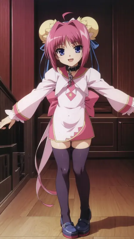 shoukyou, 1girl, solo, hair bun, ahoge, bun cover, zettai ryouiki, pink hair, double bun, long sleeves, purple eyes, collar, hands on hips, purple thighhighs, dress, open mouth, short hair, single right ribbon, serafuku