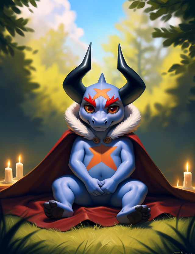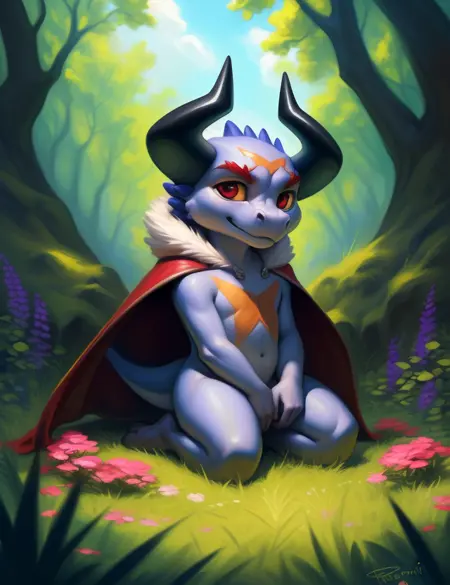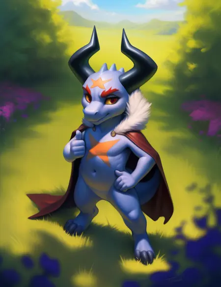 BatzzFCB, red eyes, black horns, red eyebrows, cloak, gray skin, dragon, chibi,