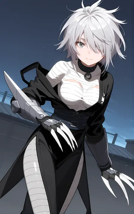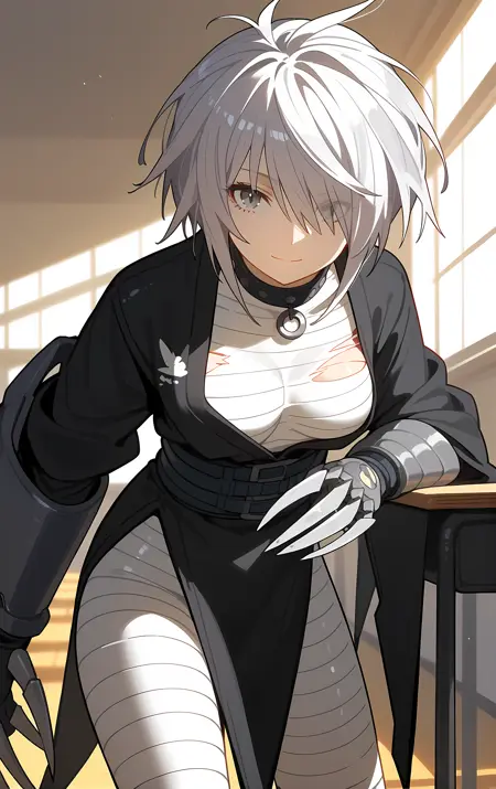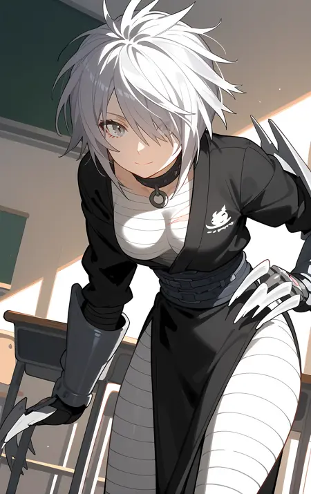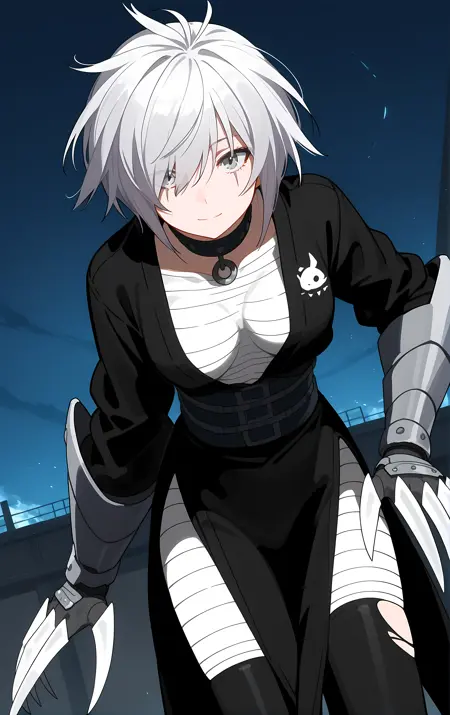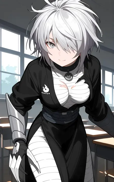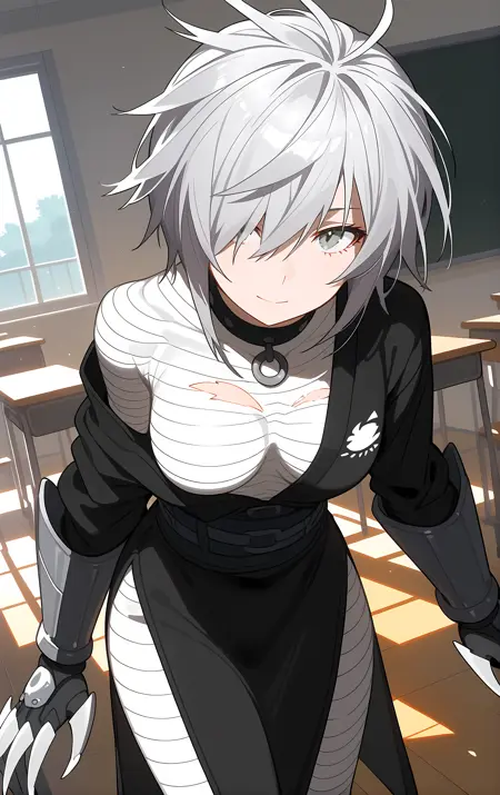 필수 → ohwx, 1girl, solo, solo_focus, breasts, medium_breasts, hair_over_one_eye, short_hair, white_hair, grey_hair, grey_eyes,