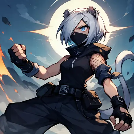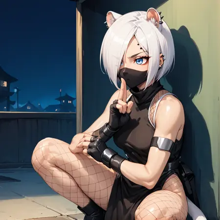 Her basic outfit : shirayubase, fishnet shoulders, black mask, no mouth, black toeless boots, wide collar, hood down, black shirt, black gloves, fingerless gloves, sleeveless, single arm warmer, black pants, rolled up pants, black clothes, belt accessory, belt pouch