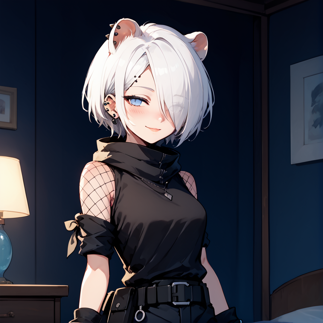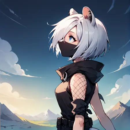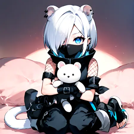 Character tags : akshirayuki, weasel ears, white tail, blue eyes, white hair, hair over one eye, ear piercing,