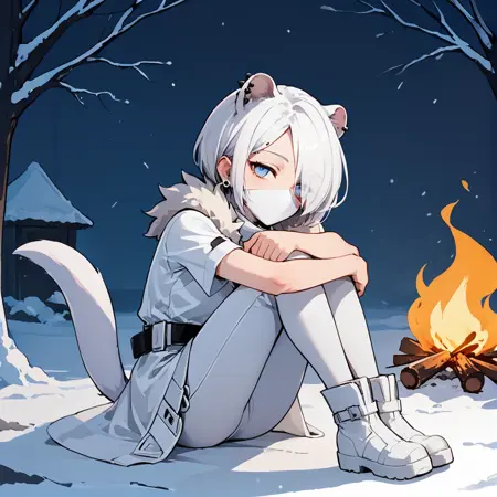 Her winter skin : shirayuskin, fur trim, official alternate costume, white hair, white mask, no mouth, white boots, white clothes, white pants, white overskirt, belt accessory, undershirt, short sleeves