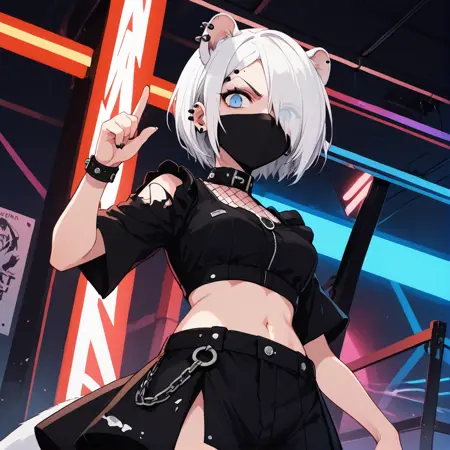 Basic outfit : shirayubase, fishnet sleeves, black mask, wide collar, hood down, black shirt, fingerless gloves, single arm warmer, black pants, rolled up pants, belt accessory, black toeless boots,