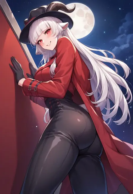 red eyes, white hair, long hair, blunt bangs, goat horns, goat ears, goat tail,