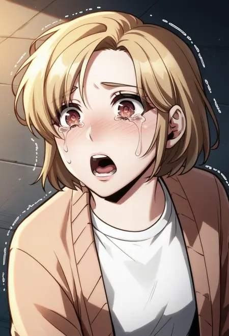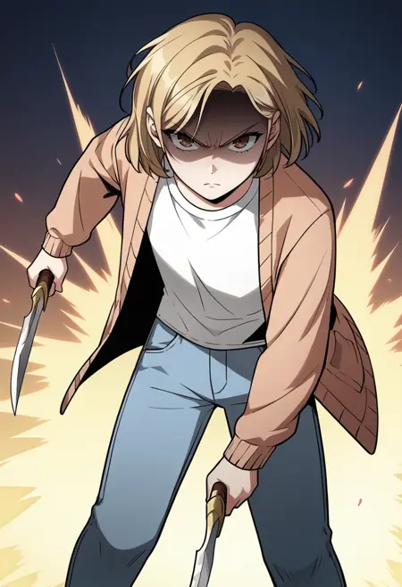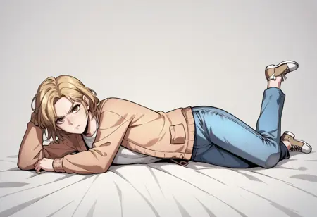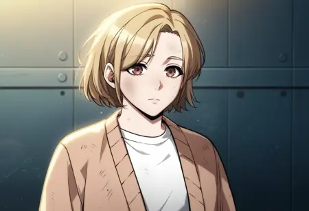 shinyoosung, short hair, blonde hair, brown eyes, white shirt, open cardigan, long sleeves, blue pants, jeans, denim,