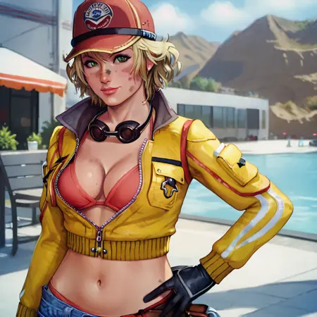 - トリガー:cindyff15, 1girl, solo, ブロンドの髪, 緑の目, 首にゴーグル, カットジャケット, ハット, デニムショートパンツ, へそ, ブラックグローブ, 短いショートパンツ, レッグハイ, 汚れた顔, 短い髪, 腹回り, ベースボールキャップ, ヤンキー色のジャケット, 唇, クロップトップ, 胸元, 下着, 衣服の下にビキニ, 水着, パンツ, ブラ, 大きな胸