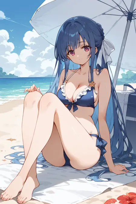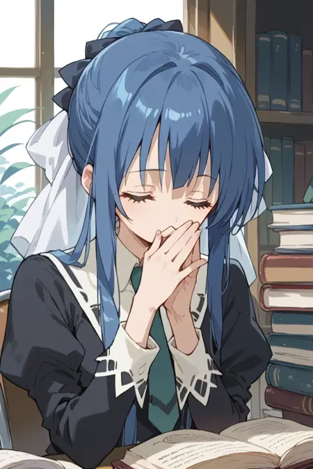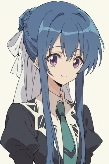 「tamao」「1girl」「blue hair」「long hair」「sidelocks」「purple eyes」を使用。
