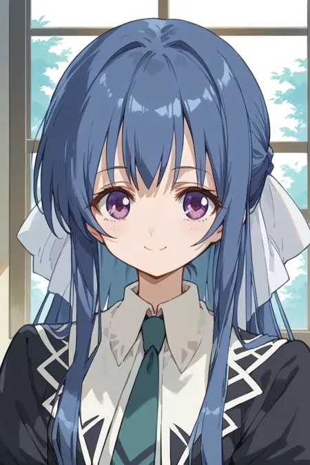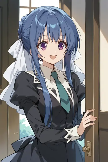 tamao, 1girl, blue hair, long hair, sidelocks, purple eyes, miator, black dress, necktie, long sleeves,