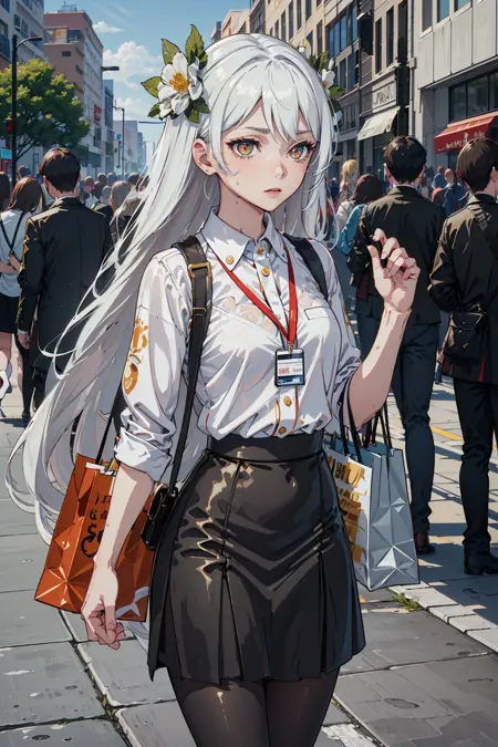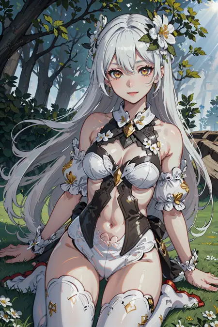 The recommended weight is 0.6 and the trigger word is "kiana". Adding "white hair, hair flower, collared leotard, detached sleeves, white legwear" can get a more stable output. To change clothes, you only need to keep the head-related prompts.