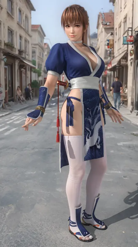 Full body Trigger Words: kasumioutfit, pelvic curtain, arm guards, wakizashi, thighs, thighhighs, sandals, choker . You can generate Kasumi's full body classic outfit by using these trigger words.