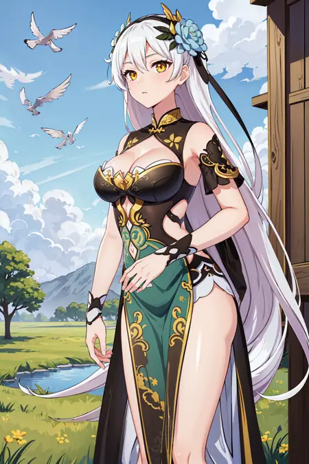 During this period, I learned some techniques for Lora training and found that there is no Lora with this skin on the website. I did this and integrated clothing that used to require a long tag into the trigger word, but there are still some shortcomings. If you want her wings and spear, you can add "wings, spear, polearm". If you don't want it, you can also add it to the negative prompt, but I feel that only the wings can be drawn. If it doesn't look like her skin, you can add "detached sleeves, hair flower, white pantyhose, leotard, bare thighhighs" to achieve more stable output. When changing clothes, you can remove the tag of the default clothing and only keep the trigger word. All the training materials are from screenshots in the game, which may appear in the background of the ship bridge, as well as my weapon. You can add "weapon, holding weapon" to remove these tags. Add "toes, toeless legwear, barefoot" to get her default skin's foot. Due to the lack of NSFW materials, it is necessary to increase the weight during generation.