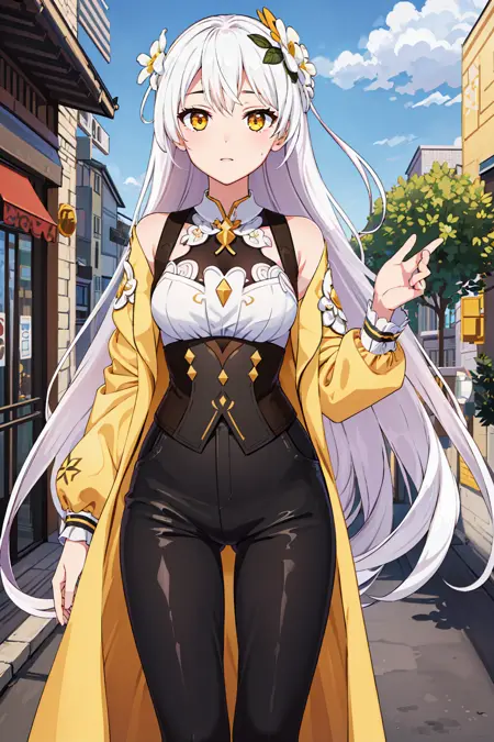 The recommended weight is 0.6 and the trigger word is "kiana". Adding "white hair, hair flower, collared leotard, detached sleeves, white legwear" can get a more stable output. To change clothes, you only need to keep the head-related prompts.