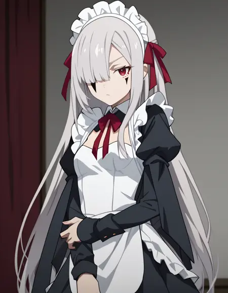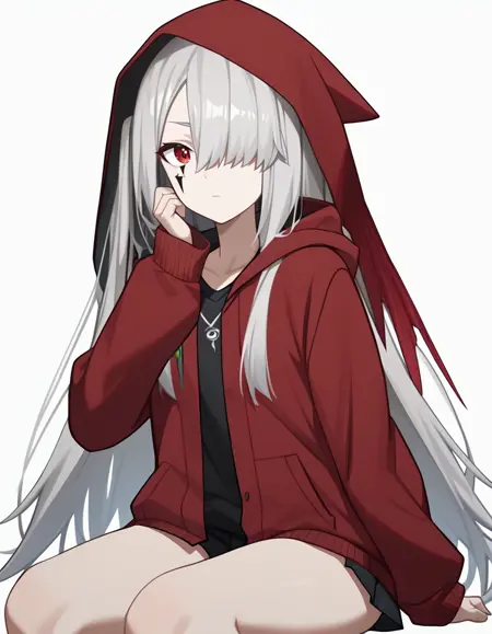 shabolina,1girl,solo,long hair,bangs,hair over one eye,facial mark,red eyes,grey hair,hair ornament,bare shoulders,red dress,dress,jewelry,