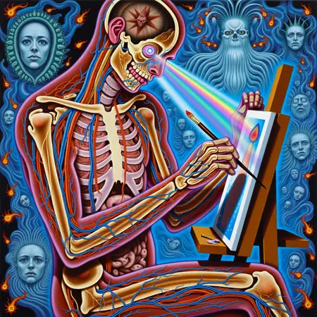 这个LoRA试图捕捉亚历克斯·格雷的迷幻与解剖风格绘画。