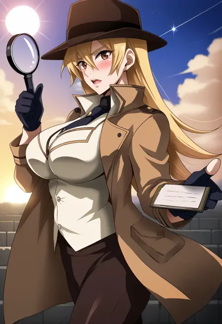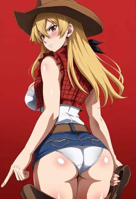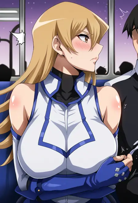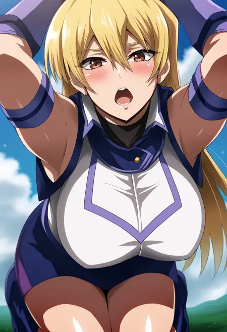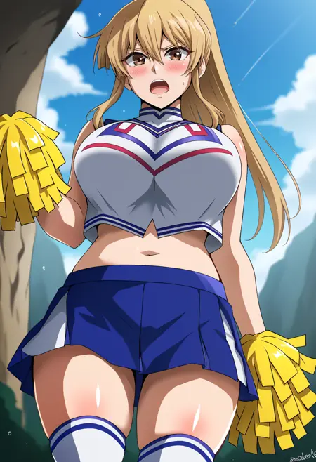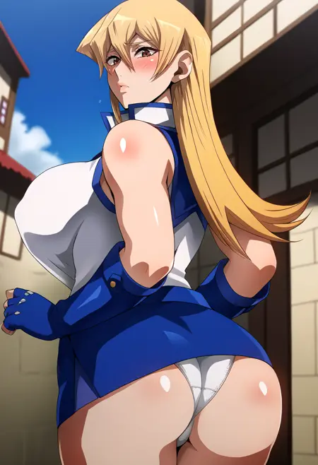 asukatj_def, brown eyes, blonde hair, long hair, hair between eyes, sleeveless shirt, white shirt, blue gloves, fingerless gloves, blue skirt, turtlneck,