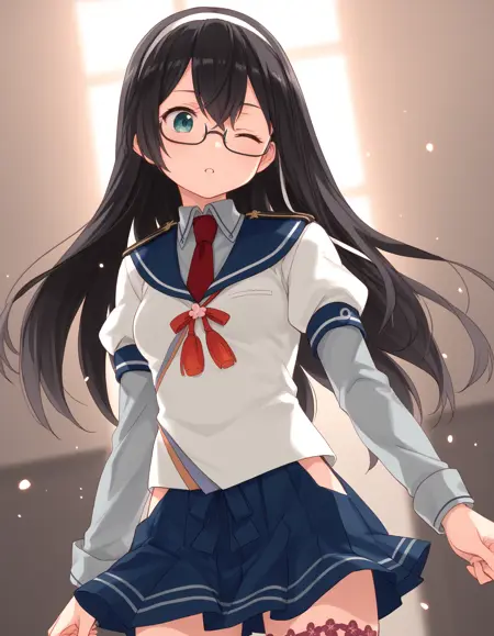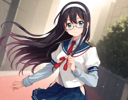 kc_ooyodo, 1girl, blue eyes, green eyes, semi-rimless eyewear, under-rim eyewear, black hair, long hair, bangs, long sidelocks, hair between eyes, white hairband